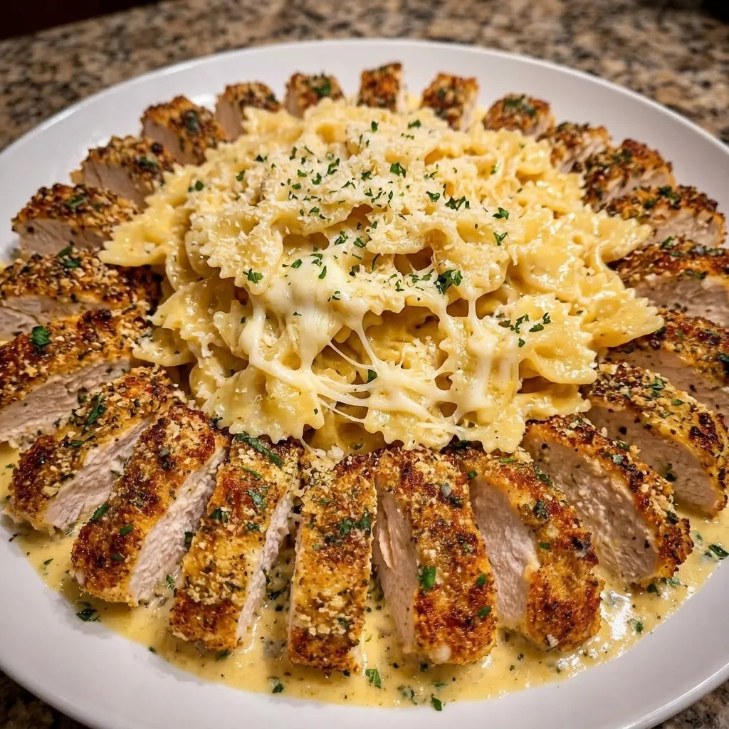 A comforting Southern dish combining tender baked chicken coated in Caesar dressing with creamy four-cheese bowtie pasta.