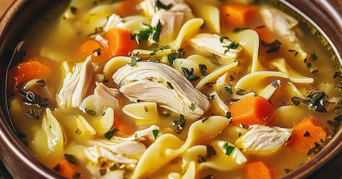 A comforting chicken noodle soup that warms the heart and brings family together with its rich flavors and tender ingredients.