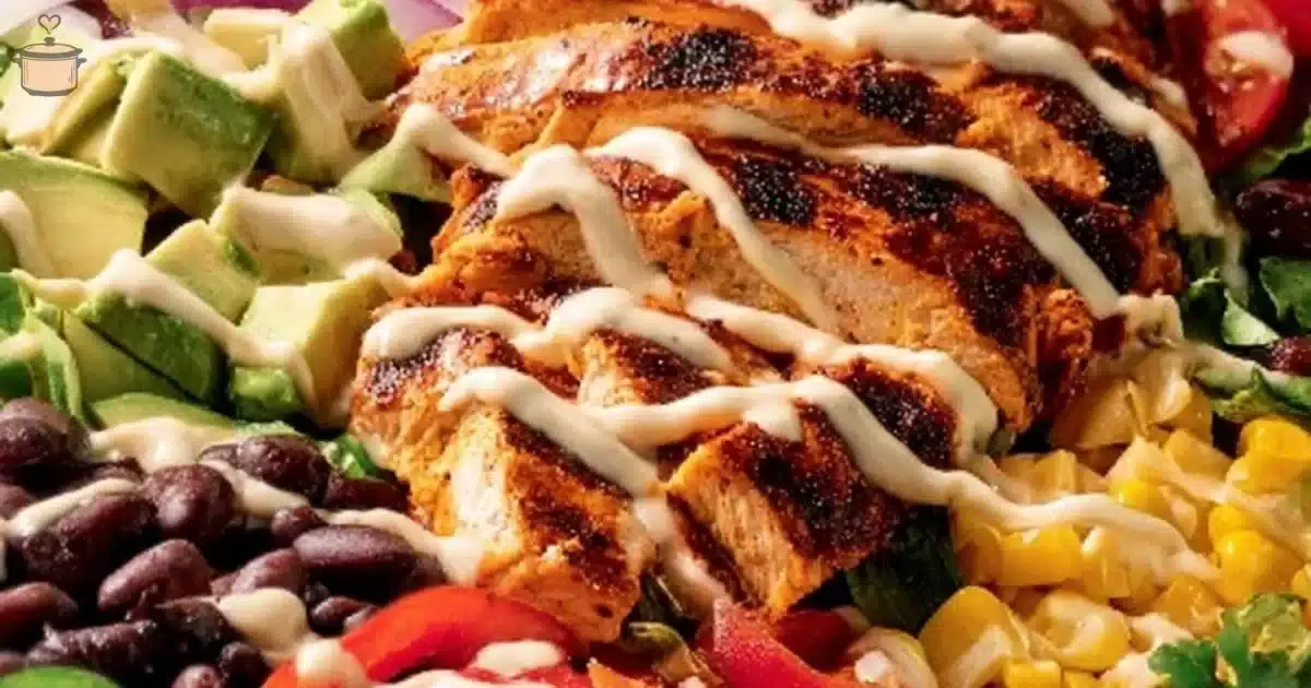 A refreshing and satisfying salad balancing smoky grilled chicken, creamy avocado, and crunchy vegetables, topped with a spicy ranch dressing.